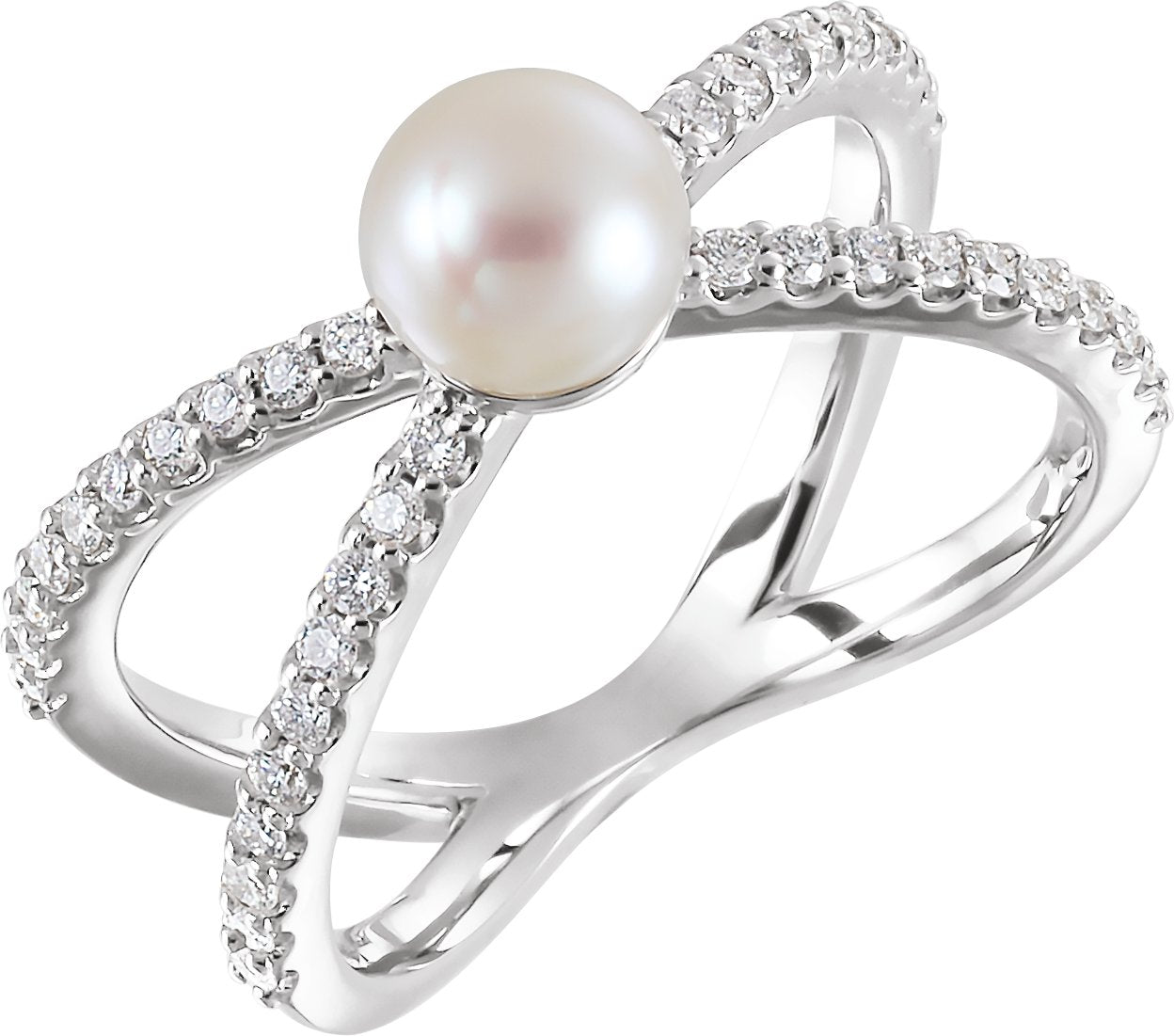 - Description: Cultured White Freshwater Pearl And 3/8 CTW Natural Diamond Negative Space Ring