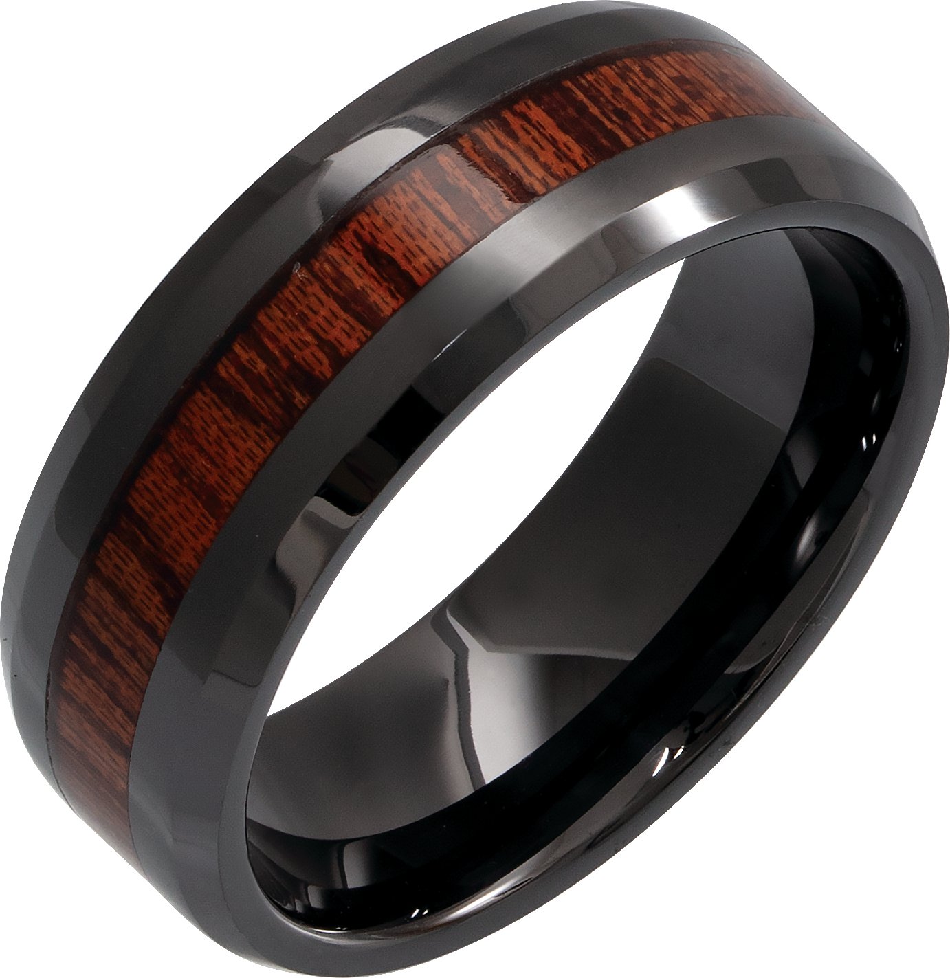 Black Ceramic Beveled-Edge Mahogany Wood Inlay 8 mm Comfort-Fit Band Size 11
