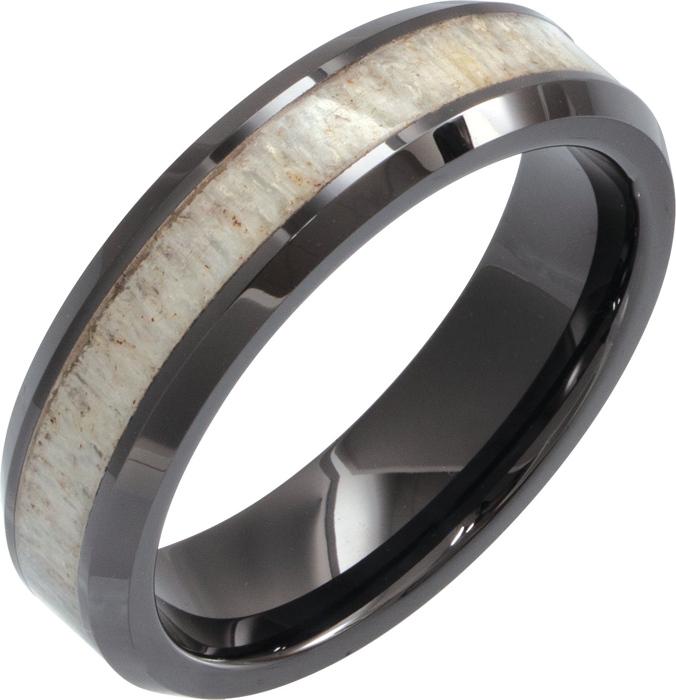 Black Ceramic 6 mm Beveled-Edge Antler Wood Inlay Comfort-Fit Band Size 7