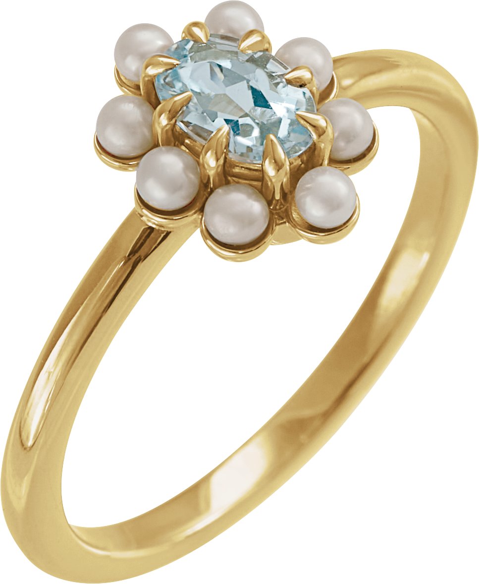 14K Yellow Natural Sky Blue Topaz & Cultured White Seed Pearl Halo-Style Ring
