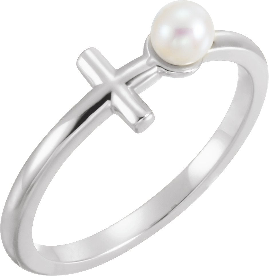 14K White Cultured White Freshwater Pearl Sideways Cross Ring