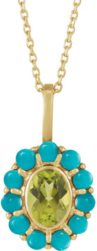 14K Yellow Natural Peridot & Natural Turquoise Halo-Style 16-18" Necklace