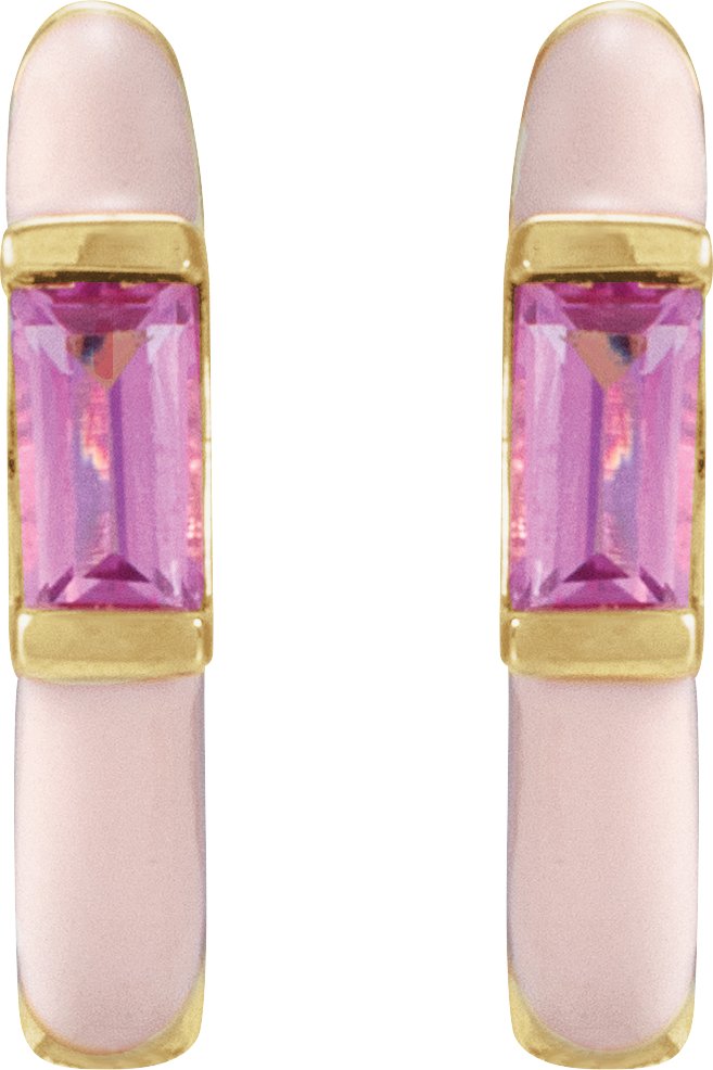 14K Yellow Natural Pink Tourmaline & Pink Enamel Hinged 11 mm Hoop Earrings
