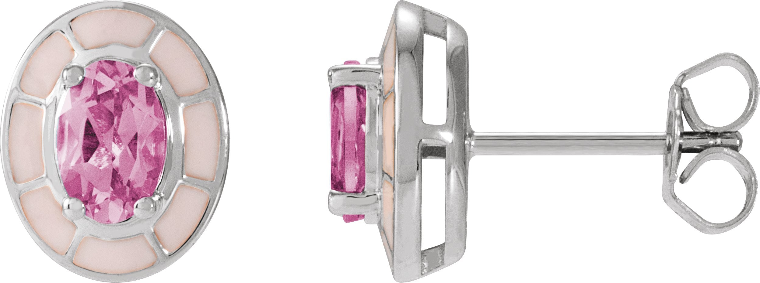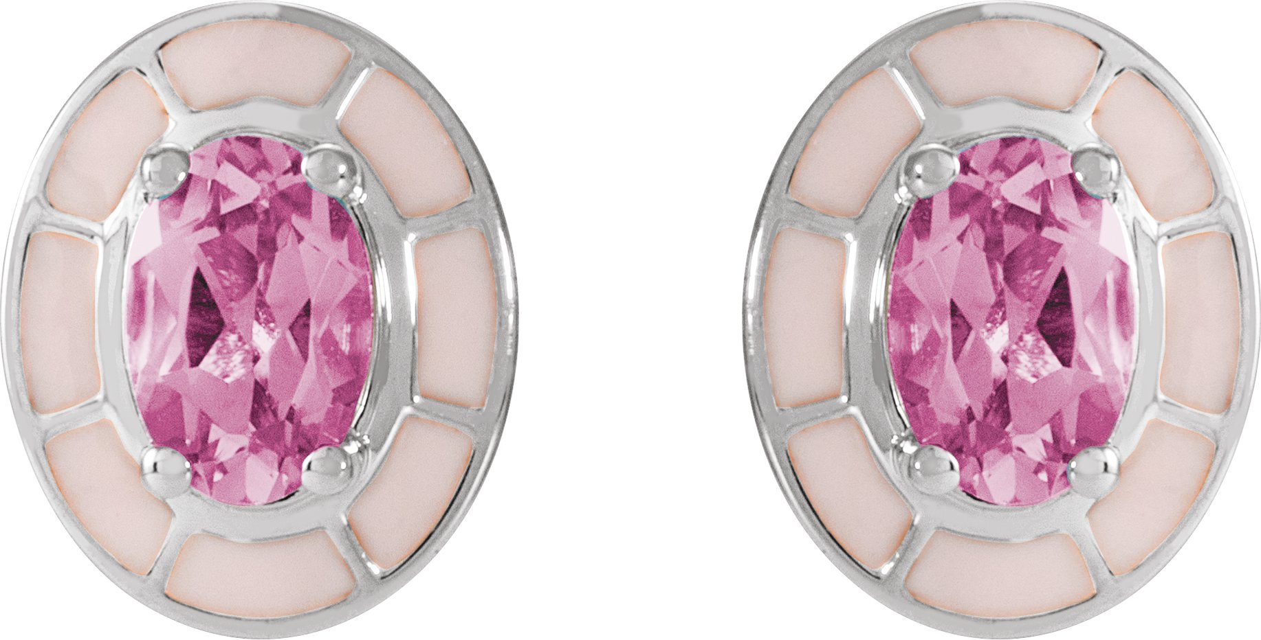 14K White Natural Pink Tourmaline & Pink Enamel Stud Earrings