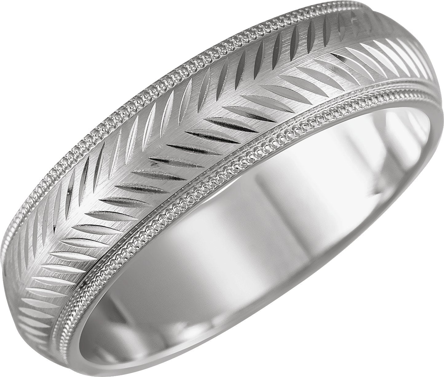 14K White 6 mm Milgrain Stepped-Edge Herringbone Pattern Half Round Band Size 10.5